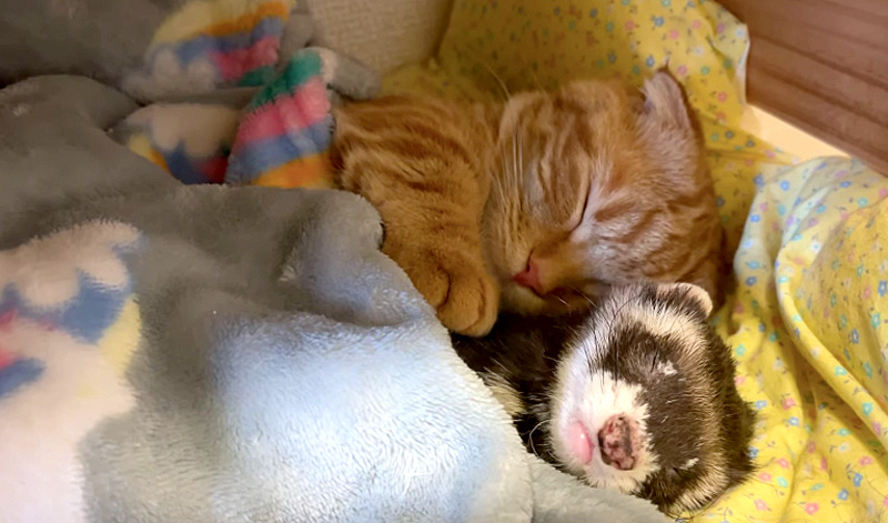 しばらくして飼い主さんが再びベッドの様子を見に行くと、ひな子ちゃんとフェレットの『ぷくちゃん』が仲良く一緒に眠っていました♡