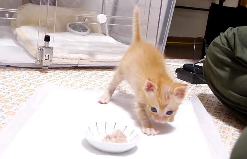 この日初めて離乳食にチャレンジすることになった保護子猫の『コンちゃん』。ご飯の時間を迎えてソワソワし始めたコンちゃんのために、養育主さんが離乳食の準備を始めました。