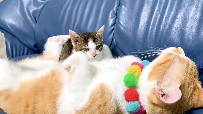 ソファーの上で毛づくろいに夢中になっていた子猫ですが、しばらくすると近くで眠っていた先住猫に突撃していきました。そしてモフモフのお腹の上で動かなくなってしまったのです♡