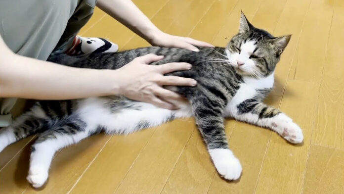 お母さんにナデナデされながら、満足そうな表情で床の上で寝そべっていた猫さん。