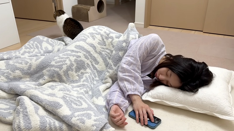最近疲れが溜まっていたのか、早起きしてすぐにリビングで2度寝を始めたお母さん。そんなお母さんの姿を見て、かまって欲しいけど起こしていいのか迷ってしまった猫の『ぽこ太郎君』。