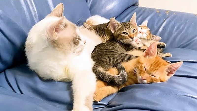 お互いに別々の場所で保護されて、養育主さんの家で過ごし始めた猫の『たまさん』と4匹の子猫達。出会ってすぐに仲良くなった猫達は、いつも一緒に過ごすようになりました。