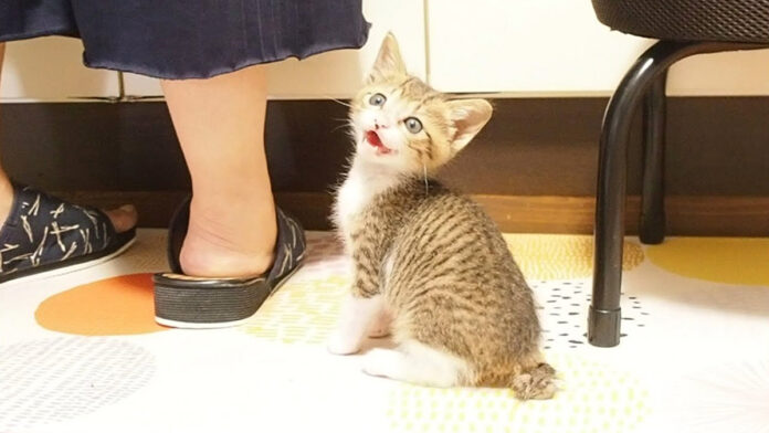 すっかり家の生活に慣れた子猫。養育主さんが朝ご飯の準備を始めると、「ご飯まだ〜!?」とばかりに大きな声で催促が始まりました。