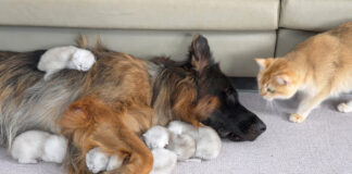 子猫の世話が驚くほど上手なジャーマンシェパードの姿に母猫もビックリ!